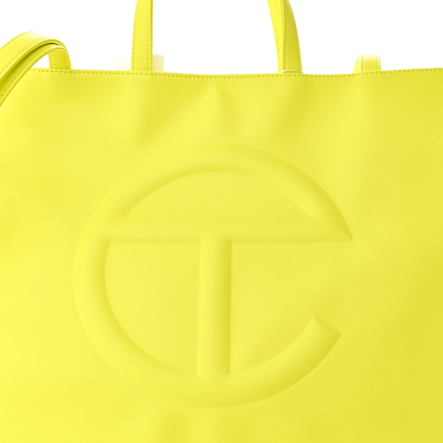Pre-owned authentic Telfar Large Shopping Bag in Highlighter Yellow is crafted of vegan leather. Features include the iconic raised Telfar logo on the front, top double handles, magnetic snap closure, twill interior lining, and crossbody strap. Comes with original dust bag.